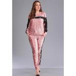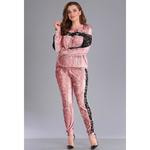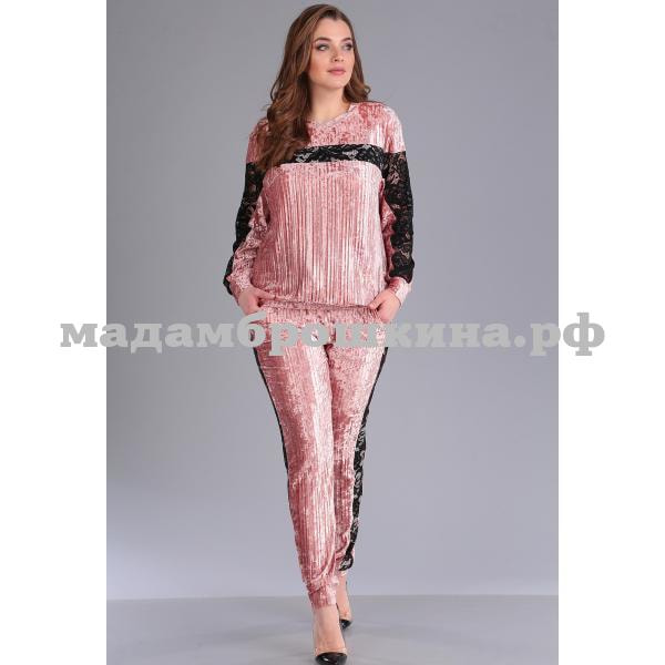 Костюм выполнен из трикотажного полотна бархат в тонкую полоску. В качестве отделки используется трикотажное полотно с наложением гипюра. Костюм состоит из джемпера и брюк. Джемпер прямого кроя со спущенной линией плеча. Полочка с нагрудными вытачками. Горловина круглой формы на притачной планке. Спинка в верхней части с горизонтальной планкой из гипюра, и кокеткой. Рукав с отделкой из гипюра по центральной части, втачной, длинный, на притачной манжете. Джемпер по низу обработан притачным поясом. Брюки, прилегающие в области бедер, слегка свободные в нижней части. По передним половинам выполнены карманы, по боковым половинам втачаны лампасы из гипюра. Верхняя часть брюк на притачном поясе, пояс с эластичной тесьмой и имитацией кулисы по центру передней части. Низ брюк на притачной манжете.. Длина джемпера: 65-67 см.. Длина рукава (с манжетой): 56-57 см.. Длина брюк по боковому шву без пояса: 98,5-99,5 см.. .Характеристики